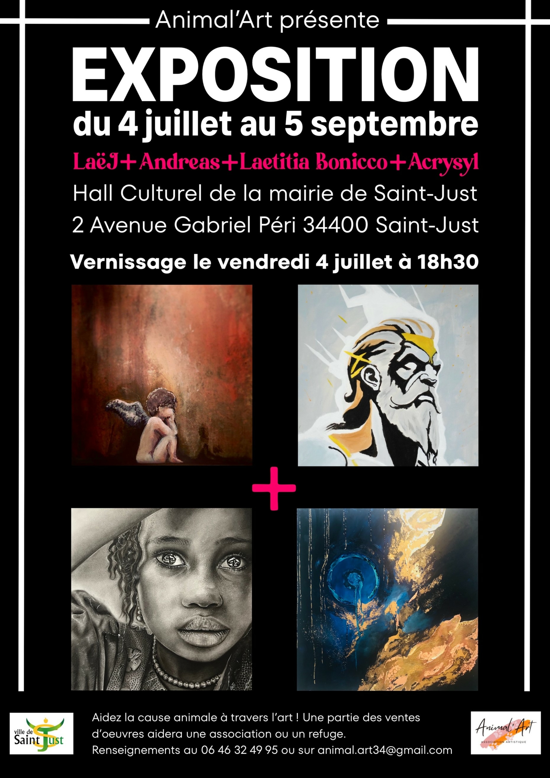 4 artistes peintres de l’association Animal’art Art exposeront leurs œuvres dans le hall culturel de la mairie : LaëJ, Acrysyl, Laëtitia Bonicco et Andreas.
