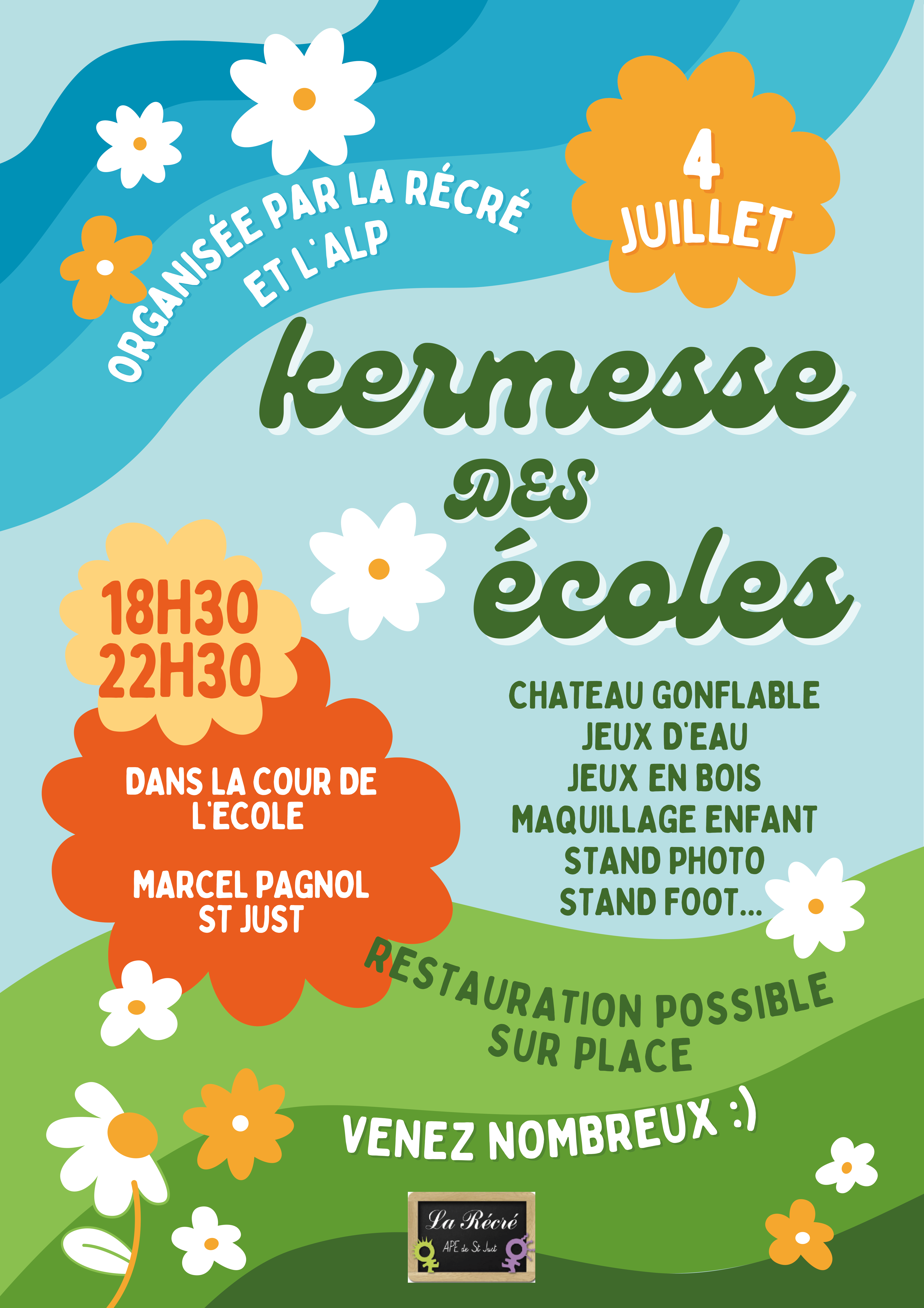 L’association la Récré et l’ALP (Accueil de loisirs périscolaire) organisent une kermesse pour les enfants des écoles de Saint-Just le vendredi 4 juillet 2025 de 18h30 à 22h30.