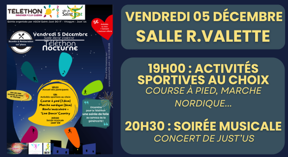 Salle René Valette jardins de la condamine, Saint-Just, FranceTéléthon Nocturne ASCM Saint-Just DO IT, Vitagym, Just’Us – Salle René Valette 18 h 30 – Activités sportives • Au choix : Course 7,5 km / Marche nordique 5 km / Renforcement + Line Dance 20 h 30 – Concert Just’Us Tarif : 5 € (activités + concert + 1 boisson)