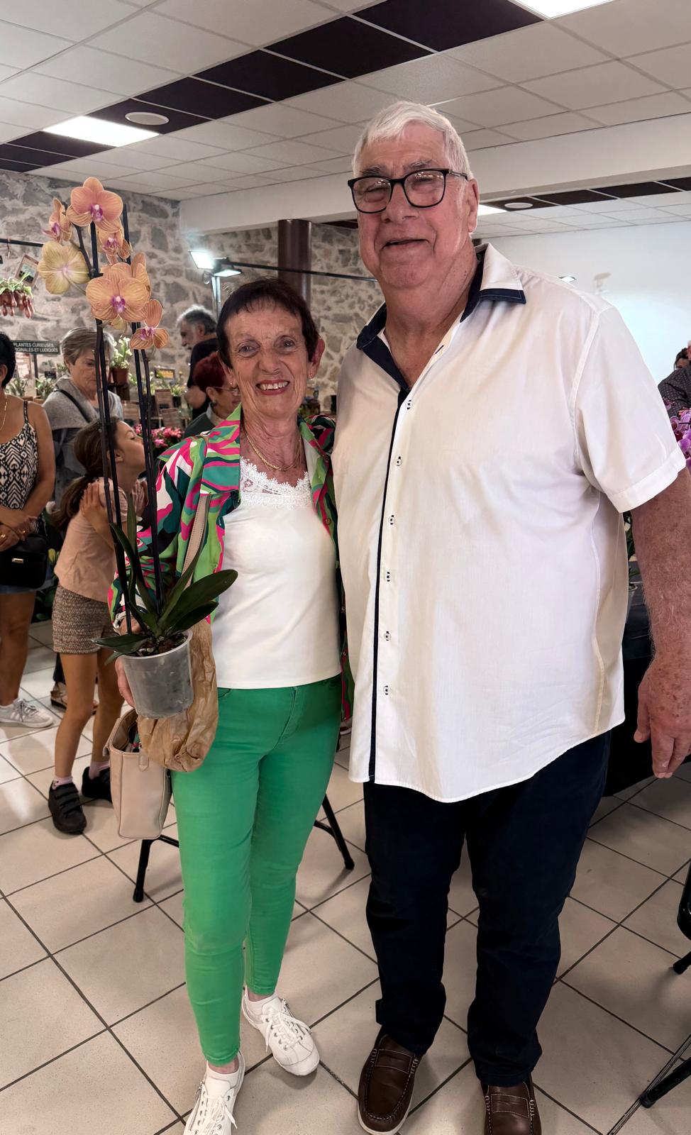 Francis Corre, organisateur de l’événement offrant une orchidée à Marise Dieulefès